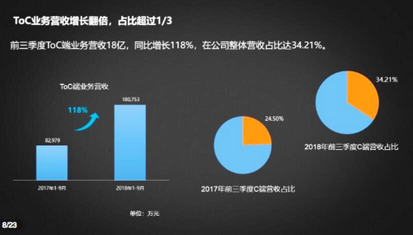 在刚刚发布的第三季财报上,科大讯飞第三季度营业收入达52.8亿元,同比增幅56%;前三季度实现归属于上市公司股东的净利润为2.19亿元,同比增长29.94%;不过扣除非经常性损益后的归母净利润仅为2462.67万元,同比下降79.75%,这也与研发投入以及员工增长有关。另外,科大讯飞在C端市场的表现成绩也有所增长。2018年前三季度,科大讯飞C端市场营业收入占总营收的1/3,而去年全年,其C端市场占营收比例约为1/4。