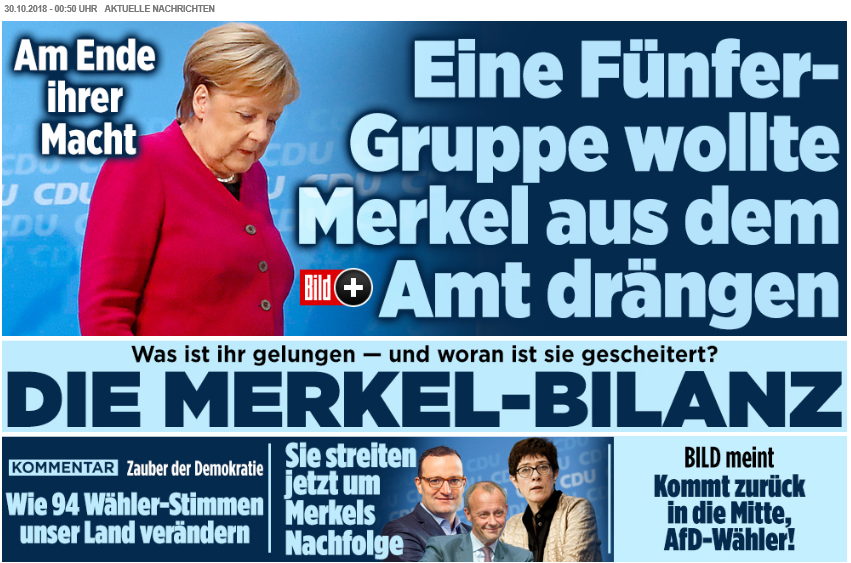 对此,德国各大媒体的报道火力全开,称默克尔宣布这一决定“正当其时”,标志着“一个时代的终结”,“这个国家最终抛弃了她”,“预示基民盟内部的改革也即将开始”。也有媒体指出,“默克尔走人”后的下一个解决方案是什么?“没有方案。”