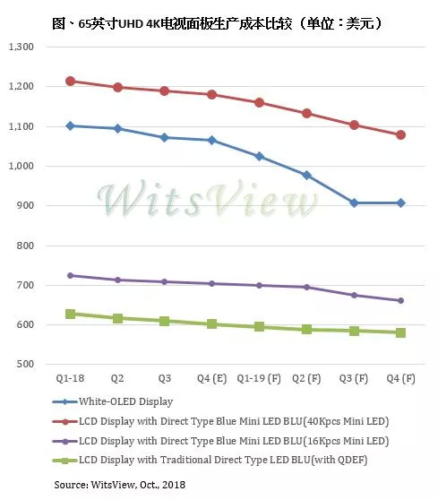 以65英寸UHD 4K电视面板为例,若采用传统高端直下式背光搭配量子点膜(QDEF),面板模组的成本约落在600美元左右,而采用Mini LED背光、LED使用颗数16,000颗的模组价格则在700美元左右。