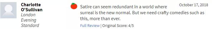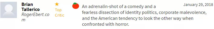 著名影评网站“罗杰伊伯特网”评论:“一部扣人心弦的喜剧,对身份认同政治、企业罪恶以及美国人面对恐怖时选择避重就轻的倾向,做了一次无畏的解剖。”