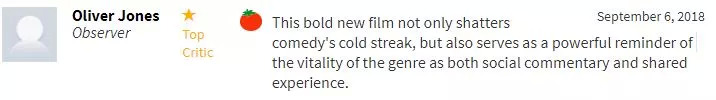 《观察者》评论:“这部大胆的新电影,不仅打破了喜剧落没的倾向,还有力地提醒人们,在社会的评论和分享经验方面,这一类型的生命力是多么强大。”