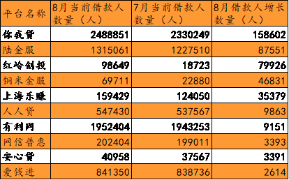 8月当月借款人增长的平台有24家,合计借款人增长43.88万人。其中借款人增长最高的前10家平台为你我贷、陆金服、红岭创投、铜米金服、上海乐赚、人人贷、有利网、网信普惠、安心贷和爱钱进。