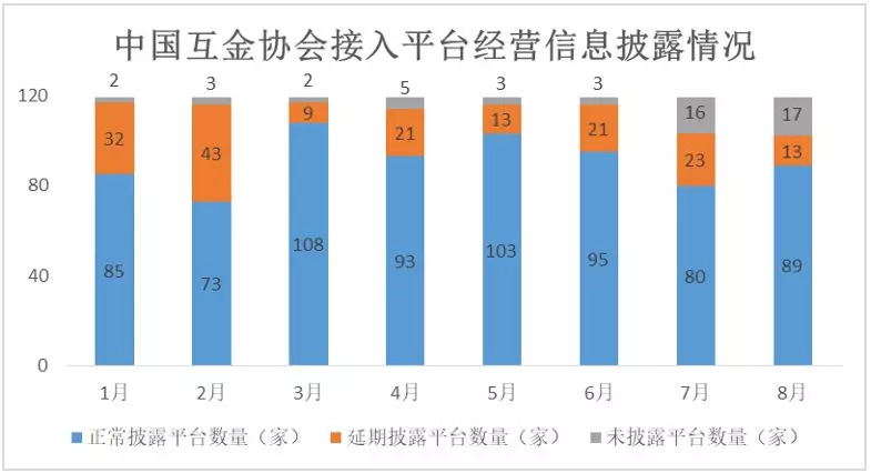 8月,119家中国互金协会接入平台中有89家正常披露经营数据,延期披露的有13家,披露信息的平台合计为102家。自6月以来,能够正常披露信息的平台维持在95家以下,虽然本月正常披露信息平台数量有所回升,但披露经营信息的协会接入平台在数量和时效仍亟待提升。