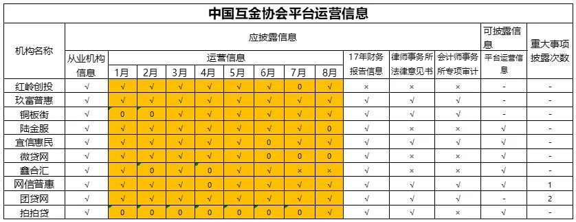截至8月末,披露2017年财务报告、律师事务所法律意见书和会计师事务所审计报告的平台分别有分别103家、27家和28家。网贷机构上一年度的财务审计报告;经营合规重点环节的审计结果和上一年度的合规性审查报告是《网络借贷信息中介机构业务活动信息披露指引》所要求的应当披露的内容。在本轮检查之中,相关平台的审计与合规报告披露情况值得网贷平台、网贷参与者和监管部门重视。