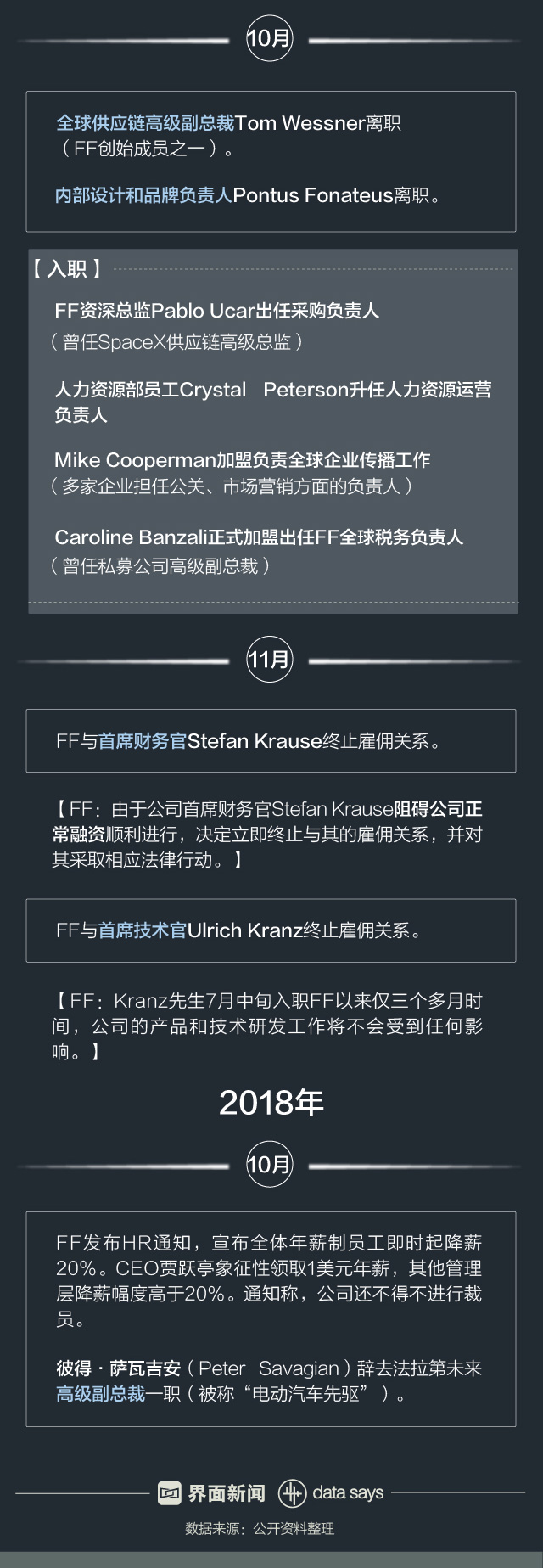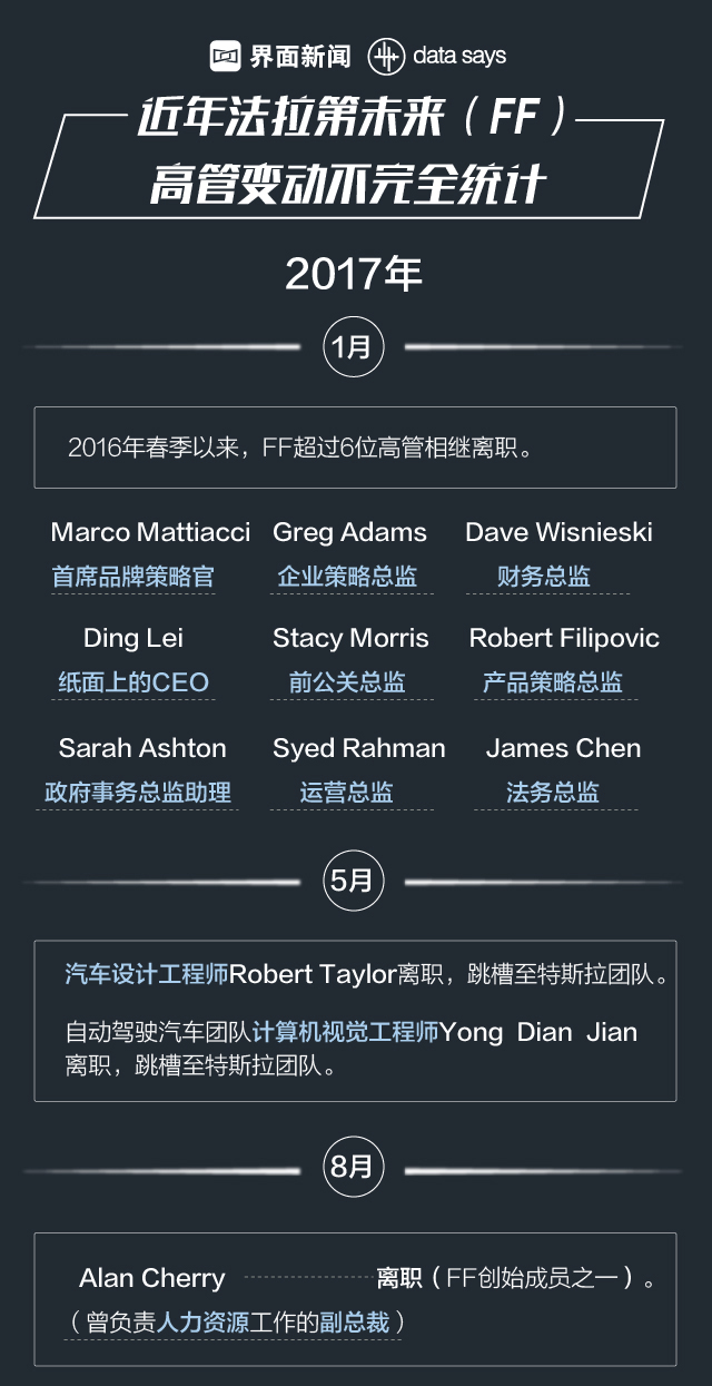 据界面数据(公众号ID:tuli_shuju)不完全统计,2016-2018年,至少11位高管从FF离职。其中包括2名FF创始成员:Alan Cherry(负责人力资源工作的副总裁)和Tom Wessner(全球供应链高级副总裁)。除此之外,FF在与Stefan Krause(首席财务官)、Ulrich Kranz(首席技术官)解除雇佣关系时曾一度引发冲突。