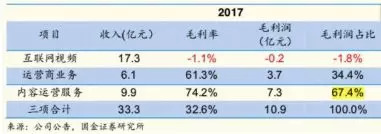 这两大业务的毛利率均高于视频业务,在2017年互联网视频业务毛利润为负的情况下,内容运营服务与运营商业务分别以74.2%和61.3%的毛利率扭亏为盈,实现10.9亿的毛利润。