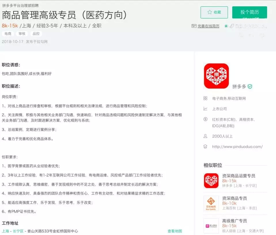招聘平台拉勾网也显示,拼多多平台治理部正在招聘商品管理专员。
