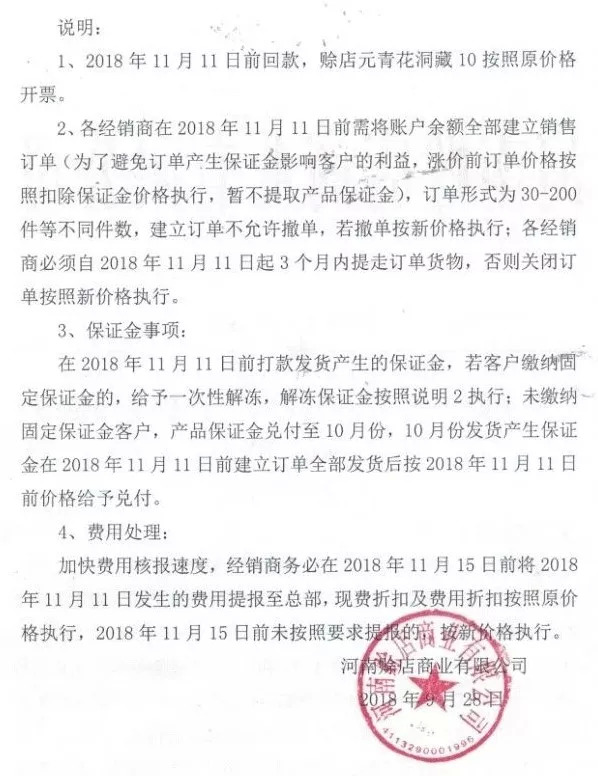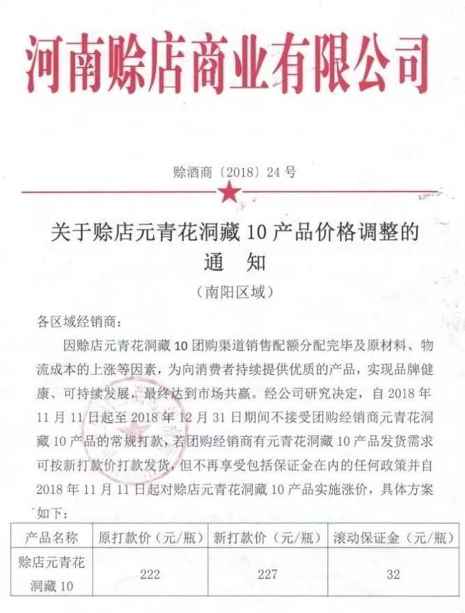 根据通知内容显示:因赊店元青花洞藏10团购渠道销售配额分配完毕及原材料、物流成本的上涨等因素,为向消费者持续提供优质的产品,实现品牌健康、可持续发展,最终达到市场共赢。赊店决定自2018年11月11日起,对赊店元青花洞藏10产品实施涨价。