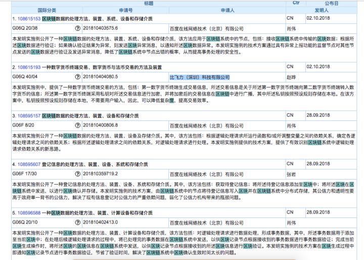 专利查询网站 patentscope 的搜索结果显示,阿里巴巴的区块链专利不仅有接近生活服务技术类的,甚至在最新日期的专利中,有针对行业热点的共识节点、区块存储等热门技术。