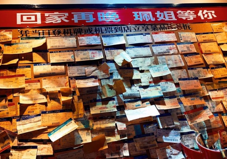 不仅如此,珮姐还规定,凭三天内的机票或者动车票,就可享8.8折优惠。这一招很见效,如今珮姐的墙上已经贴满了不同出发地的机票。内参君注意到,像何师烧烤等一些其他餐厅也开始运用这招来招揽外地游客。