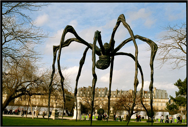 在西方基督教文化传统里,蜘蛛是邪恶的象征,常代表吸食人血的罪恶的冲动。布尔乔亚以蜘蛛的生理结构和行为习性赋予了它新的文化符号,进行了一次深度解剖内心世界的自传式创作。“蜘蛛”是由焊锡金属管、青铜、不锈钢和大理石组成的巨大的汞合金,与庞大高耸的腿部结构相比,主体较为瘦小,它的腹部挤满了用大理石制成的球体,代表了卵巢内孕育着无数新的生命。蜘蛛是承载了布尔乔亚强烈而婉约的情感指向物,在她看来,蜘蛛是对母亲的颂歌。母亲是布尔乔亚最好的朋友,如同蜘蛛捕食害虫、编织网络一样,隐忍地为家庭奉献,聪明坚强地保护孩子。