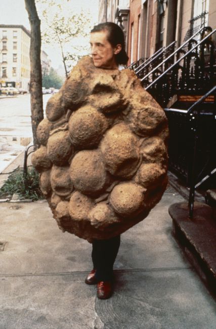 在众多以“性”为主题的作品中,最广为人知的是她在1968年创作的《小女孩》(Fillette)。这件作品主体是青铜浇筑而成的巨大男性生殖器,布尔乔亚在其上铺垫乳胶,增添了几分肉质感。它被悬挂着,摇摇欲坠,透露出一种无助感。作品中的性别消解产生了歧义,虽然它明显形如阴茎,但同时也如题目所暗示的那样,可以被看作女性躯干:两个圆形是两条腿的顶部,附着在髋关节上。在双重象征意义的支撑下,布尔乔亚想表达的是,不论作为男性器官还是女性躯体,两性都是敏感而脆弱的,都需要支撑和保护。