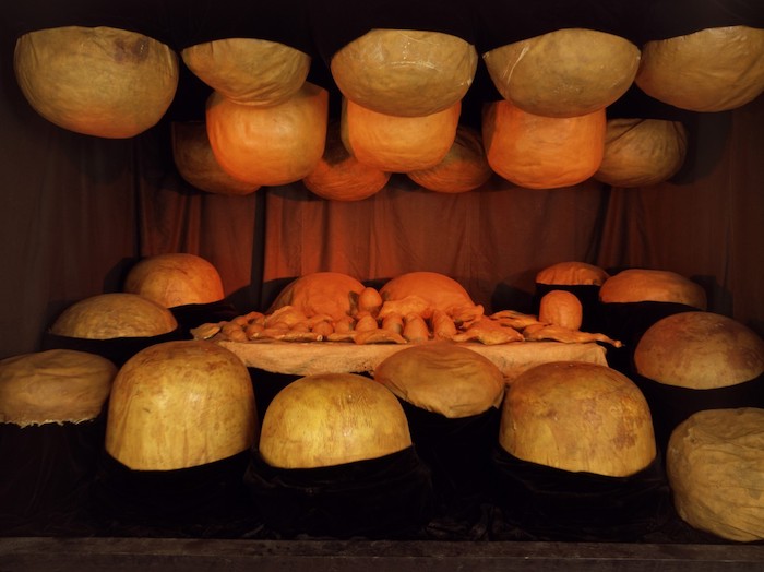 对父亲的憎恶、对背叛的绝望、对家庭关系的忍无可忍交织成一股紊乱感,贯穿了她一生的创作。《父亲的毁灭》便是布尔乔亚对父亲进行艺术形式上复仇的勇敢尝试,同时也是对其权力支配地位的一种记录。这件作品整体呈现肉色色调,在一个柔和的形似子宫的房间中散落着很多半球体、柱体,像是破损的乳房,又像是不规整的凳子。房间中央有一张长台,它可以被双重解读——既是餐桌也是床。红色的灯光投射下来,加剧了空间内血腥恐怖的气氛,这一切都象征着一场已完成的碎尸。在布尔乔亚看来,床是人出生和死亡的停留地,而父亲对婚姻关系的背叛也在床上有所体现,父亲渐渐腐蚀的状态在这张诡谲的床上暴露无遗。另一方面,作为餐桌,它体现着父亲被孩子们肢解、摧毁和食用的意象,孩子们对父亲的清算正是对其不忠的终结。对父亲的这种报复是舔舐旧伤口的本能反应,本质上是对童年的一种疗愈。
