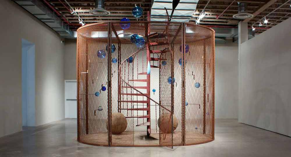 在这件作品中,楼梯被铁丝网笼包围,网笼的墙上有一扇狭窄的拱门敞开着,友好地向观众发出了隐秘邀约。许多具有象征意义的物品都堆叠在其中,地板上,两个厚重的大木球分别代表着她的父亲母亲。楼梯四周悬浮着天蓝色的玻璃球,这些球体不断扩大、向天空奔去,仿佛液体中因上升而膨胀的气泡。一些螺纹转轴攀附在笼子的铁丝网上,这是对布尔乔亚家人修复挂毯的车间的隐秘重现,也是她幼时协助母亲做工的记忆复刻。作品中央垂吊着一个明亮的蓝色泪珠,它被漂浮的轻盈感所鼓舞,没有滴落,执拗地占据着观众视野的最佳位置。这滴眼泪是布尔乔亚对自己的描述,临近生命尽头,她似乎抛弃了对死亡或监禁的恐惧,幽默地排解了沮丧感,任凭负面的、伤痛的泪水凝固在时间里,以一种更为乐观的方式换取和记忆的和平共处。