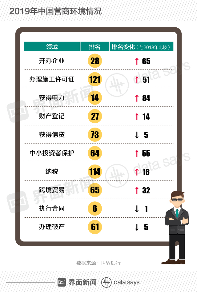 根据世界银行数据,中国营商环境改善突出,在多个领域都有显著进展。