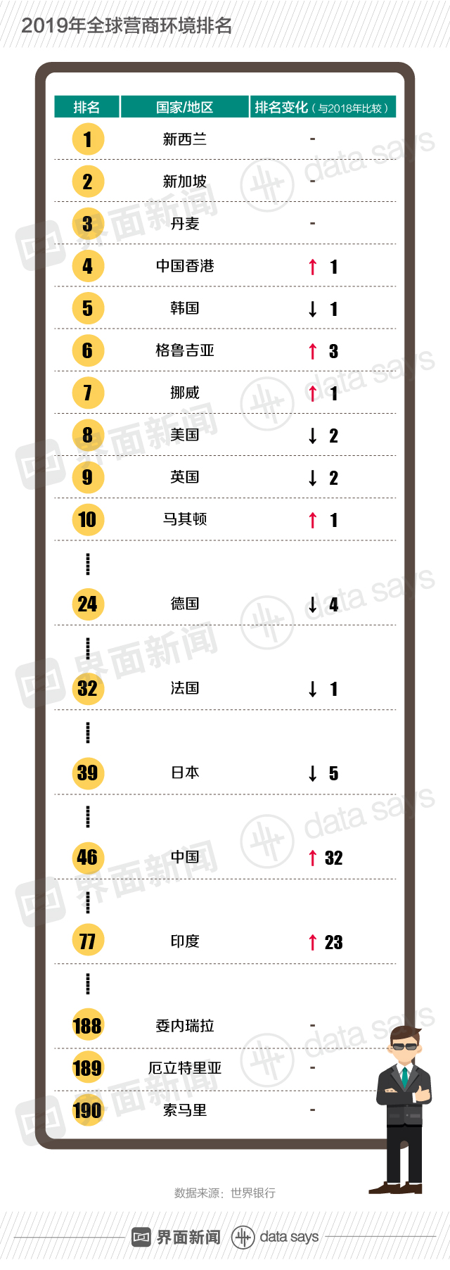 2018年10月31日,世界银行发布《2019年营商环境报告:为改革而培训》。在2019年全球营商环境排名中,新西兰、新加坡和丹麦排名前三。中国今年排名大幅上升,从去年的第78位上升至第46位,进入全球排名前50的经济体之列。