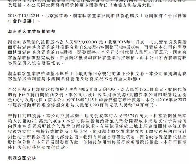 出售完成后,映客从51%的控股权减少至40%,而另一个股东长沙龙湖房地产开发有限公司股份则由49%增加至60%。映客须支付总收购代价约人民币4.9亿元的40%,即人民币1.96亿元。收购代价的余下60%将由开发商龙湖地产支付。据映客方面介绍,映客已使用内部财务资源支付收购代价。