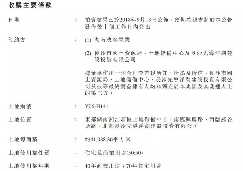 资料显示,2018年9月13日,湖南映客置业在拍卖中以人民币4.9亿元成功获得位于湖南湘江新区的土地使用权。该土地总面积约4.11万平方米,拥有40年的商业使用权年期及70年的住宅使用权年期。