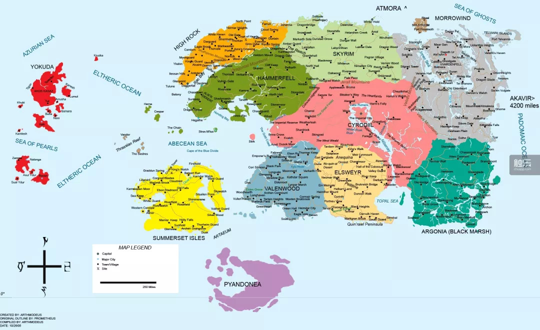 奈恩世界地图。国内许多网站把奈恩称为“星球”,这或许不太准确,按照游戏的设定来说称为“世界”更为恰当。玩家们熟悉的《上古卷轴5:天际》的故事发生于地图北部的Skyrim行省
