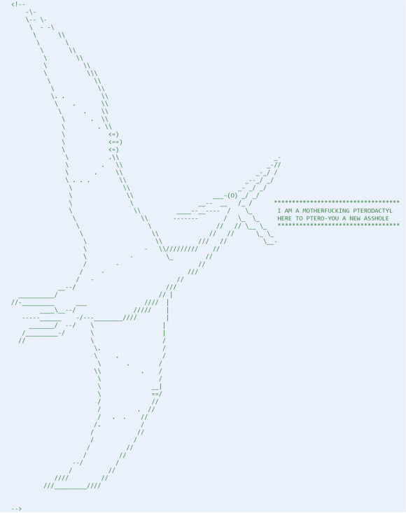 下面这只暴走的翼龙来自网站Oatmeal。该程序猿一定是在连续加班一周调试程序的时候遇到搞不定的Bug了。