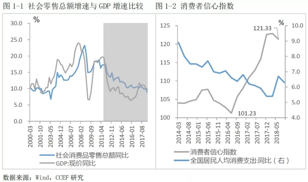 从2012年开始,社会零售总额增速就一直处于下行通道中,与GDP增速趋势一致(图1-1),从2017年12月开始,社会消费品零售总额同比增速降至个位数。与此同时,GDP与社会消费品却高速增长,虽然居民人均消费支出增速自2014年以来有所放缓,但消费者信心指数却在不断上升。由此可以推断,零售消费总额增速下降一方面和基数规模有关,另一方面和消费结构的变化有关(社会消费品零售总额不包括网上非实物零售额等数据)。