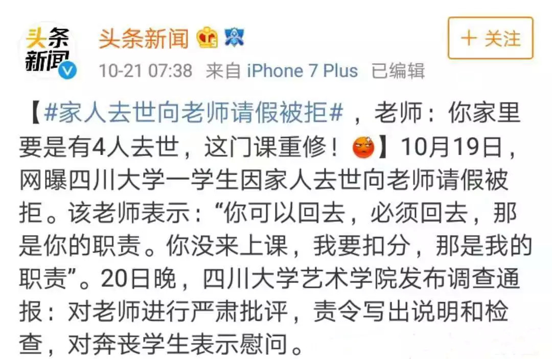 像“四川大学学生因丧请假被拒”事情中那样的老师,毕竟还是少数。大部分老师们都是有同理心的,只要请假理由合理,一般都会请给学生。