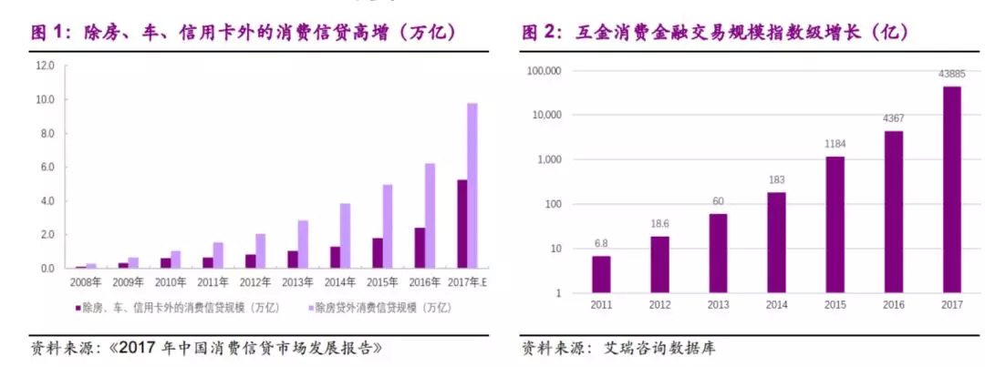 根据《2017年中国消费信贷市场发展报告》数据显示,截至2017年底,我国除房贷外消费信贷市场规模达9.8万亿。其中除房、车、卡外其他消费信贷规模约5.2万亿,五年复合年均增长率在45%左右;互联网消费信贷预计达4.4万亿,五年复合年均增长率逾350%。