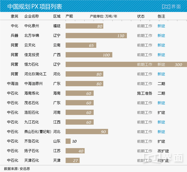 在接受界面新闻记者采访时,江苏省一位石化企业负责安全工作的人士称,PX已经被过度妖魔化。“无论从风险程度还是产品毒性,PX与其他化工项目相比都没有什么特殊之处。”该人士说。