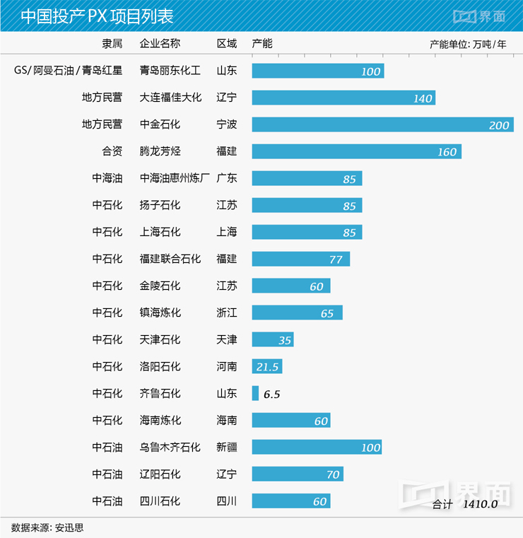 国内当下投产的PX项目拥有1410万吨的年产能,这些工厂隶属于中石化、中石油、中海油,以及类似腾龙芳烃这样的合资或民资炼厂。
