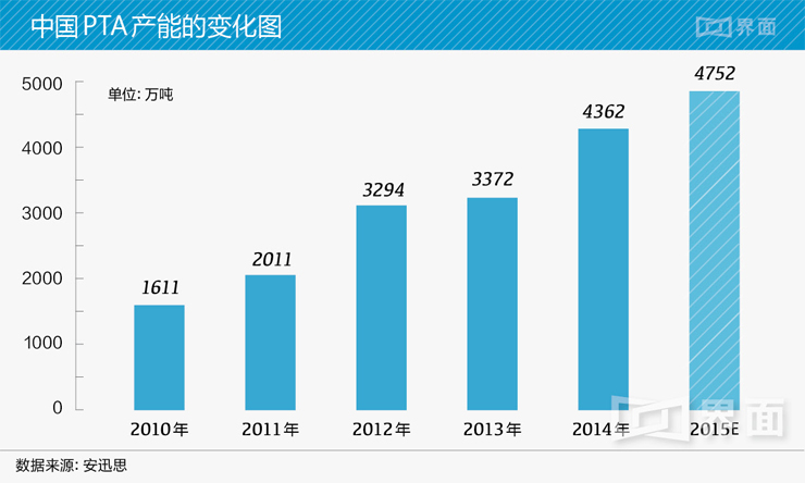 普氏能源资讯亚洲石化执行主编黄宝莹告诉界面新闻记者,随着数座新工厂投产,到2016年中国PTA的产能有可能增加至每年5000万吨。