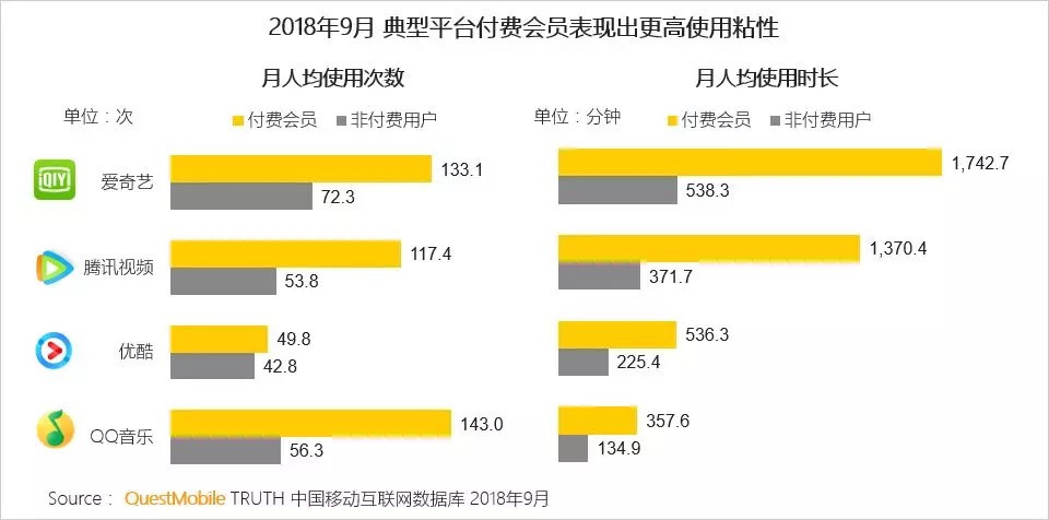 根据Questmobile的数据显示,以爱奇艺、腾讯视频、优酷、QQ音乐四个平台为例,付费用户的月人均使用次数和月人均使用时长,都要远远高于非付费用户,而且差距往往都在一倍以上。
