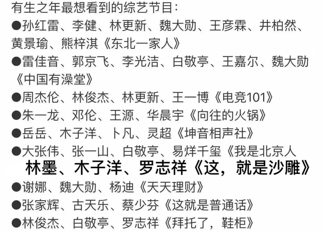 其实,网友们发散思维、大开脑洞的时候,也知道这些创意可能只适用于想象,大佬们也因为各种原因没法安排。但这份片单还是能映射出观众的不少真实需求,大佬们不妨也来看看,观众究竟喜欢什么样的综艺。