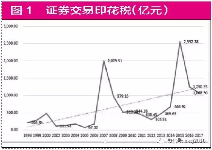 图1是每年证券交易印花税征收额,根据2017和2018年市场成交金额波动不大分析,估计2018年印花税收取是千亿元左右。如果降低印花税,从1‰降低到0.5‰则每年能减少证券市场500亿元交易成本,降为零减少1000亿元交易成本。