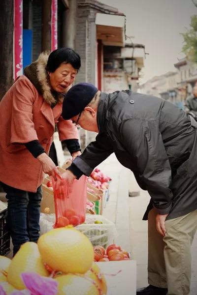 ▲ 在太谷东街上买水果的姜伟。当地人说,姜伟比祖宗八辈都在太谷的太谷人还要熟悉太谷