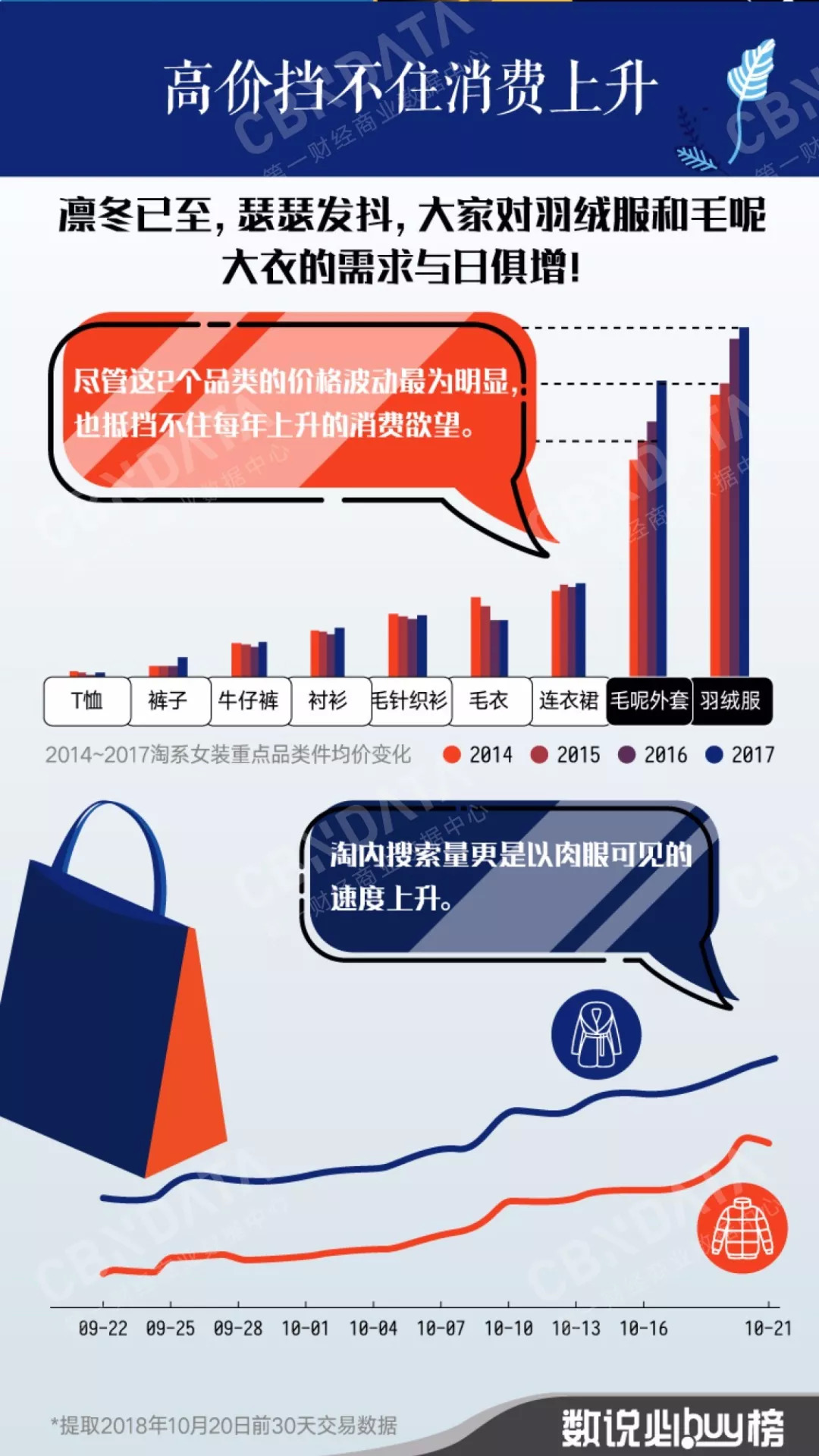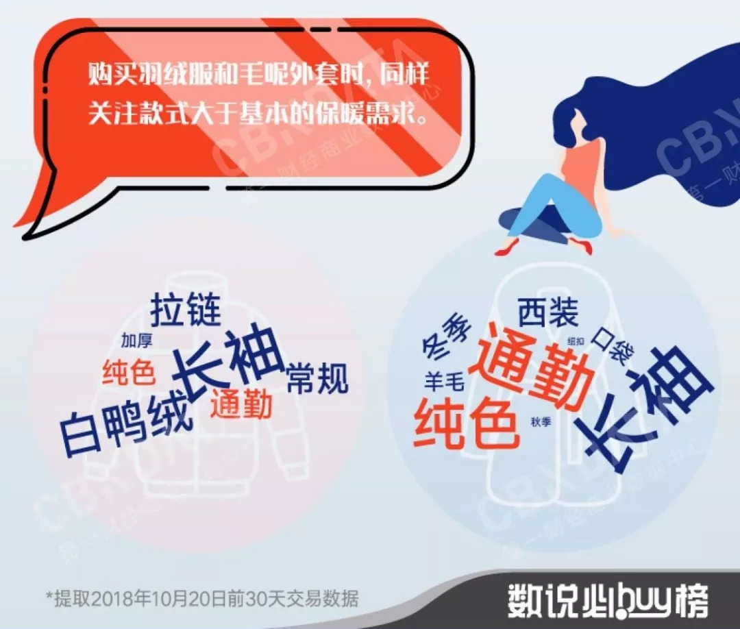 根据CBNData消费大数据显示,秋冬必备单品中的毛呢大衣和羽绒服近年来价格蹭蹭蹭地往上涨,可大家伙儿的添置却不见颓势,每年一入秋就会想到它们。