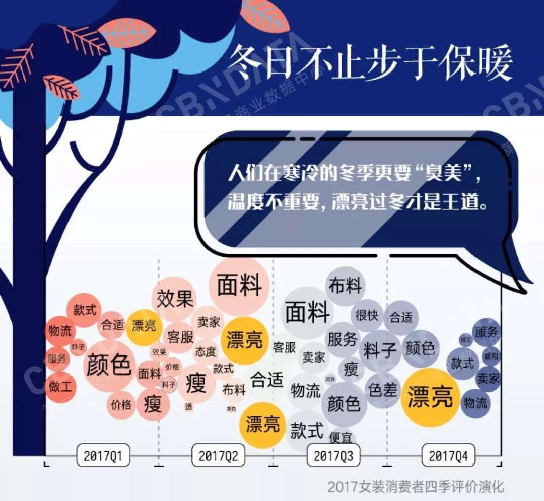 按理说,御寒衣物够穿就好,为啥妹子们每个秋冬都不“够”穿呢?如果你从女装消费一年四季的评论中的关键词可见,“漂亮”是永恒的王道。