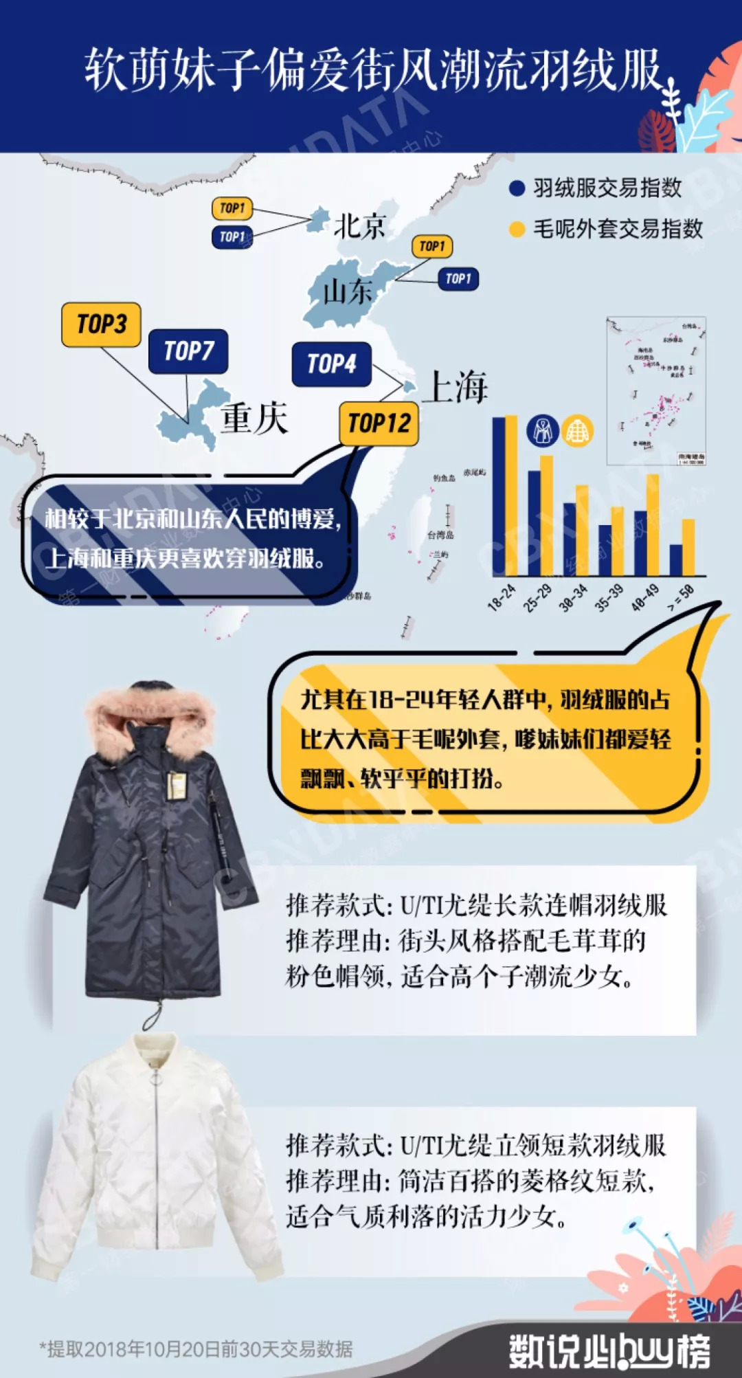 根据CBNData消费大数据显示,上海小妞和重庆小姐姐是羽绒服的拥护者哦,那还等什么,赶紧长短羽绒服来一套,这个秋冬有了它们就是“型”。