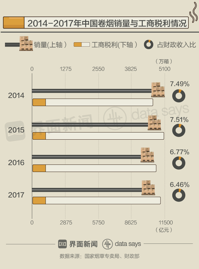 根据国家烟草专卖局数据,烟草行业是中国中央和地方政府的重要财政收入来源,2017年中国卷烟创造工商税利11145亿元,占当年财政收入6.46%。