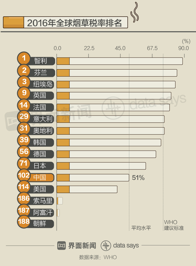 根据世界卫生组织报告,2016年中国的烟草税率为51%,在全部的188个国家和地区中排名第102位,与世界卫生组织建议的75%仍存在差距。