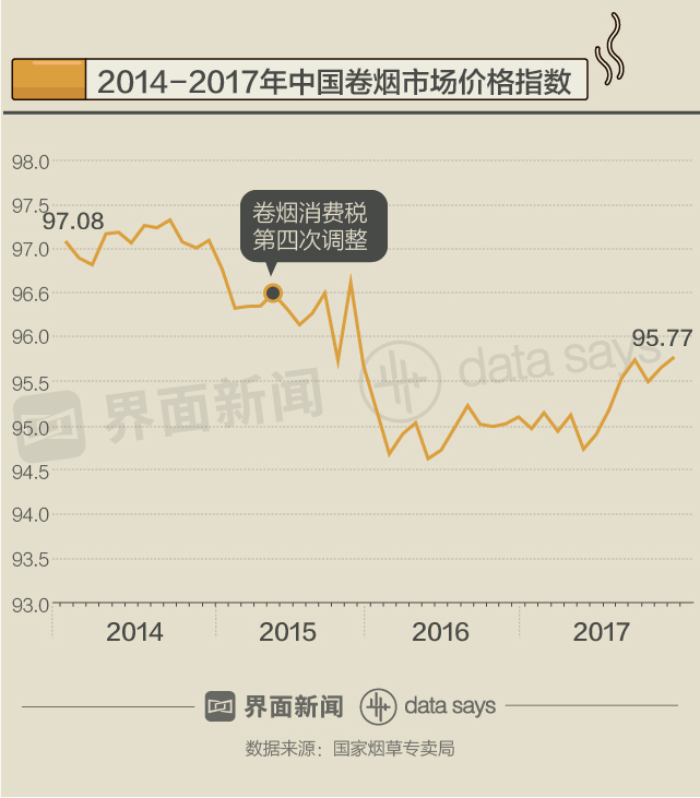 根据全国卷烟市场商业直测网络的监测数据分析,经历2015年第四次烟草税调整后,中国的卷烟市场零售价格指数下滑,中国卷烟零售价格持续疲软。直到2017年开始,零售价格指数才逐渐回暖。
