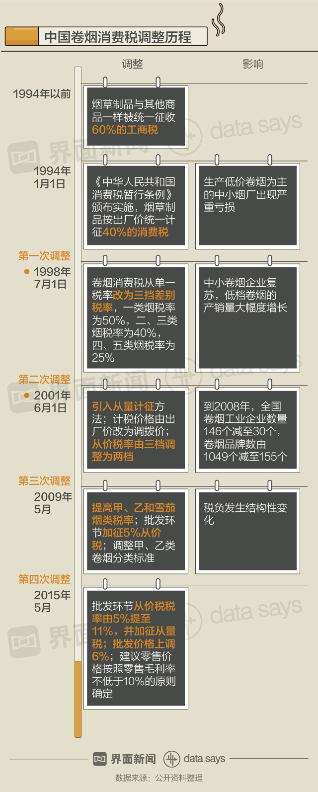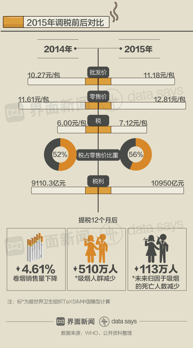 中国最近一次调整烟草税是在2015年5月。根据《烟草税:理论、制度设计与政策实践》,与2014年相比,2015年一至五类烟的批发价格和零售价格均有所增长。税占零售价比重从52%上升至56%,税利从9110亿元升至10950亿元。