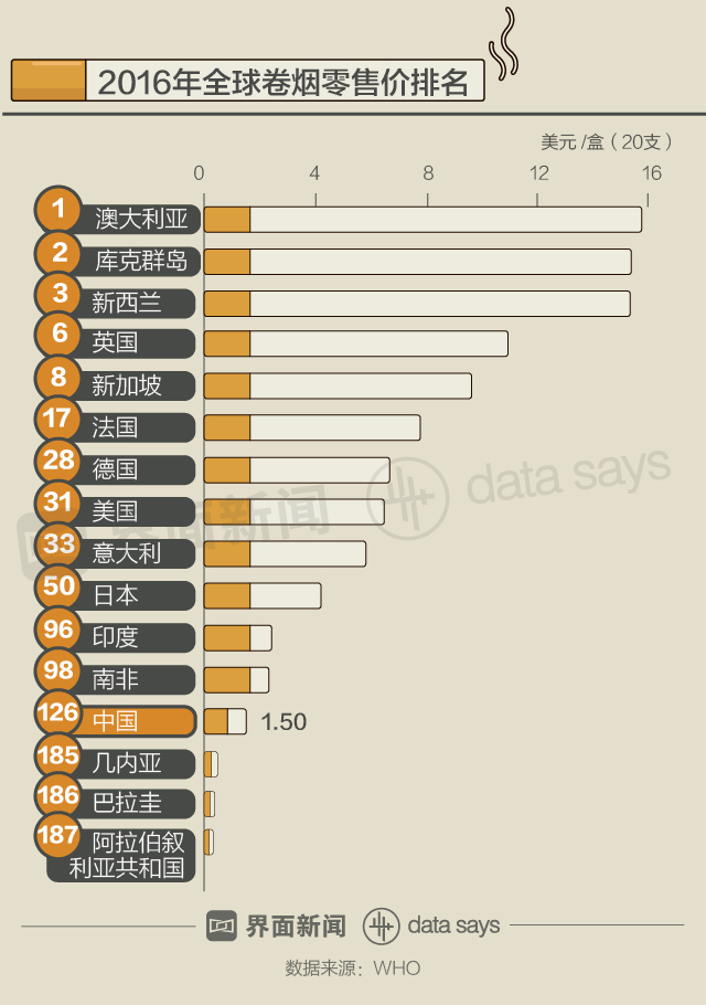 比税率排名更低的是零售价排名。2016年中国卷烟零售价格为1.5美元/盒(20支),在WHO录得数据的187个国家和地区中排名第126位。