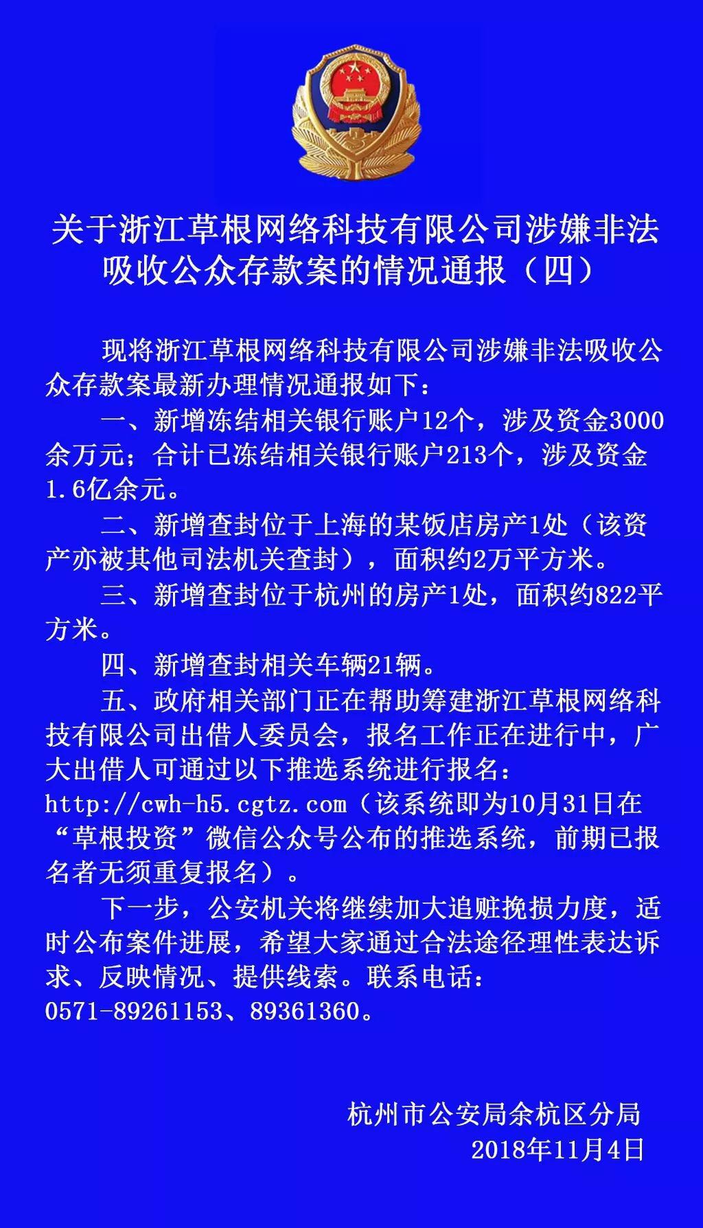11月5日凌晨,杭州市公安局余杭区分局通过微信公众平台通报草根投资案情进展。