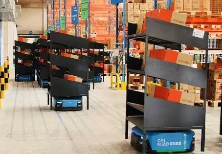 在位于江苏无锡的未来园区内,近700台AGV机器人开工。它们会互相避让,自己充电,有的负责带着订单箱,自己赶到指定区拣货;有的负责带着移动货架,自己去找到订单箱装货。
