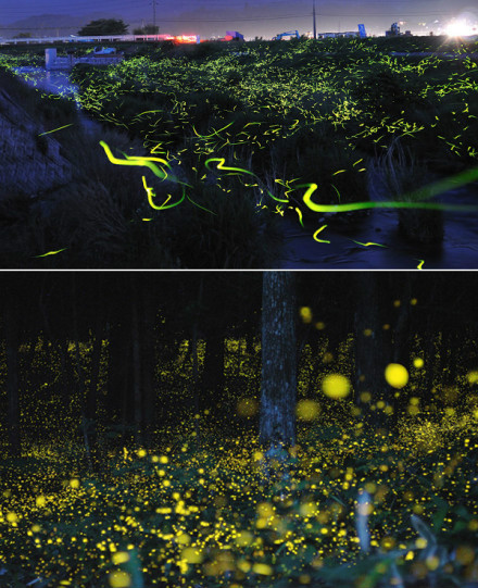 【萤火虫】摄影师:Tsuneaki Hiramatsu 在日本乡间,摄影师偶然发现夜晚的一片田地闪烁着奇怪的绿色光芒,走近才发现是成千上万的萤火虫徘徊在这片区域。他使用低速快门(Slow Shutter)的方式拍下萤火虫飞舞的美丽景象。