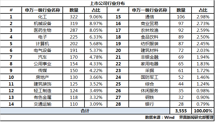 截至11月初,沪深上市公司除ST长生(002680.SZ)以外均已完成2018年三季度业绩披露。界面新闻根据Wind数据整理,共有3555家上市公司完成了业绩披露,其中沪市2116家,深市1439家,计算包含18年新上市公司。上市公司申万一级行业分布如下: