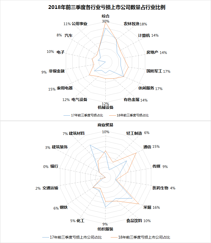 2017年度同期全行业共计有273家上市公司亏损,占比7.7%,与前年相比变化不大。而2018年前三季度全行业共计有353家上市公司亏损,占比9.9%,亏损程度相较去年同期明显扩大,但相较一季度以及中报情况有所收缩。从能力图的分布上可以看到除了建筑材料、纺织服装以及化工业有所改善以外,其他行业今年前三季度的亏损情况均较去年严重或持平。