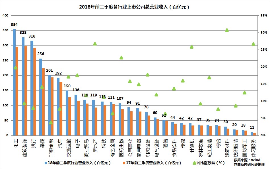 2018年前三季度全行业总收入为318,992亿元,同比增长13.13%。其中,第一位的是化工业,前三季度以35,448亿元的总收入占全行业的11.11%,收入同比增长19.85%。排在第二位的是建筑装饰业,总收入32,751亿元,行业营收同比增长9.39%。如果去掉金融板块,前三季度全行业总收入为267,335亿元,同比增长14.55%,相较中报同比增速微幅改善。