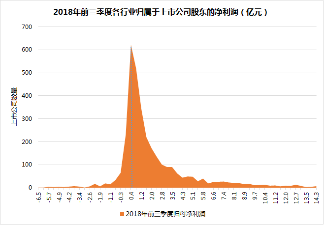 2018年前三季度,上市公司里的9成归母净利润落在负2亿至正12亿的区间之内,分布峰度较高,反映为业绩扎堆的现象。全行业归母净利润均值为8.18亿元,中位数为1.02亿元,其中业绩在5亿以下的公司有2939家,占到总数的82.67%。