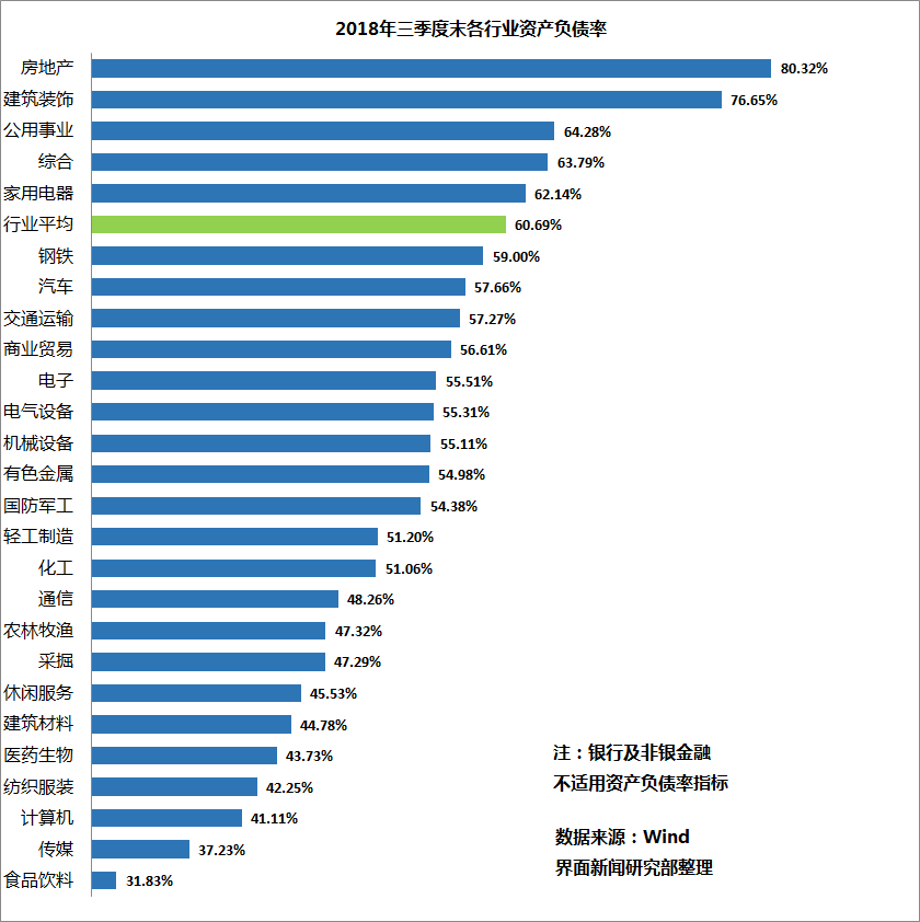 资产负债率是衡量负债水平及风险程度的重要标志。截止2018年前三季度末,房地产业资产负债率最高,为80.32%,相较中期的79.89%进一步提升。资产负债率最低的行业为食品饮料行业,为31.83%。剔除掉银行与非银金融板块后,全行业资产负债率为60.69%,与18年上半年末相比微幅增加0.16%。